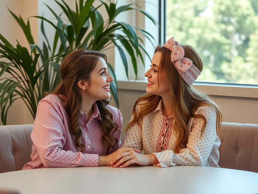 Две девушки в наушниках работают за компьютерами в ярком и комфортном офисе. Яркие цвета и теплый свет.